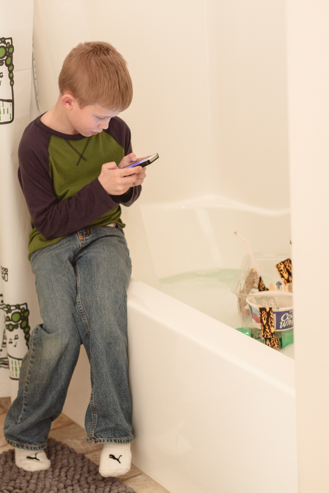 He flipped the phone around so he could film his face and then back to the boat and then … the phone fell in the tub. I quickly snatched it up and said ‘ohemgee’ under my breath and he quietly sat while I rushed the lifeless phone into the kitchen. For a while, the sound wasn’t working so Connor, forever the optimist, said it was good we could at least still play games on it. I told him that without sound a phone becomes a little less useful. I can’t listen to music for crying out loud.